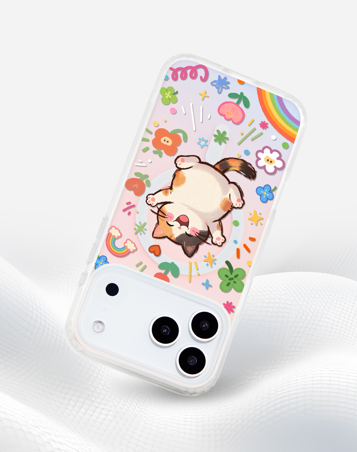 iCraftPro | Dopamine Cartoon Kitty Magnetic Case for iPhone 12-17 Pro Max, Holographic Cover with Lanyard