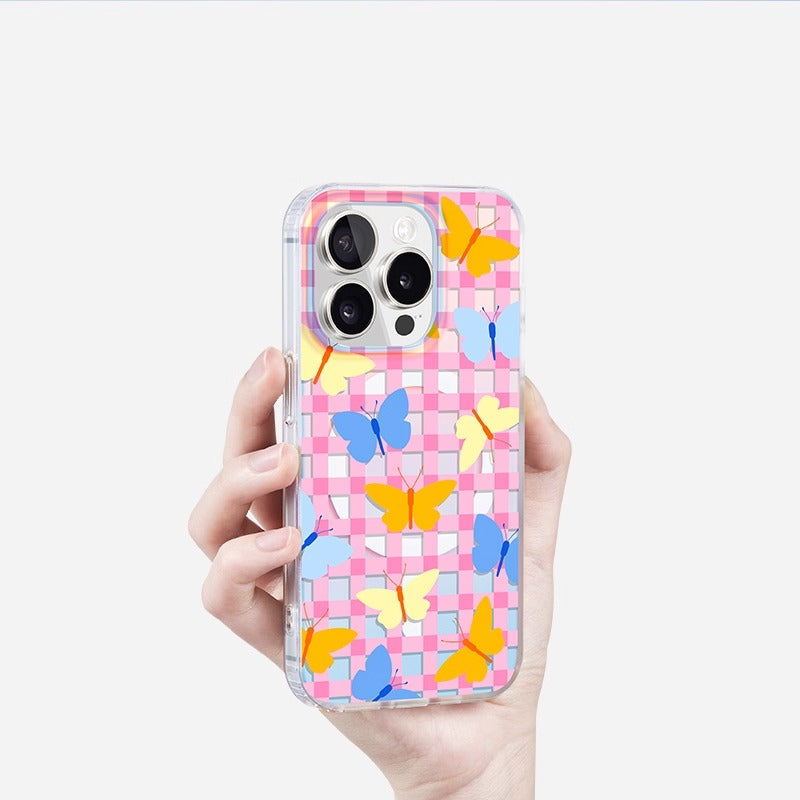 iCraftPro | Magnetic Case with Plaid & Butterflies for iPhone 12-17 Pro Max, Holographic Finish